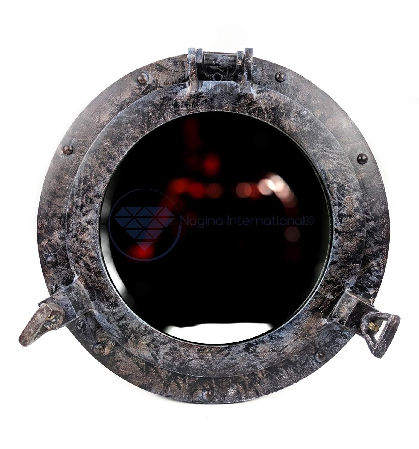 Nagina International 11″ Rustic Grey Black Antique Porthole Mirror | Pirate’s Ship Window Wall Hanging | Antique DecorPorthole Overall Diameter (Outer Most Ring) – 11 Inches (Approx) | Viewing Area – 07 Inches (Approx) | View Type – Reflective Mirror